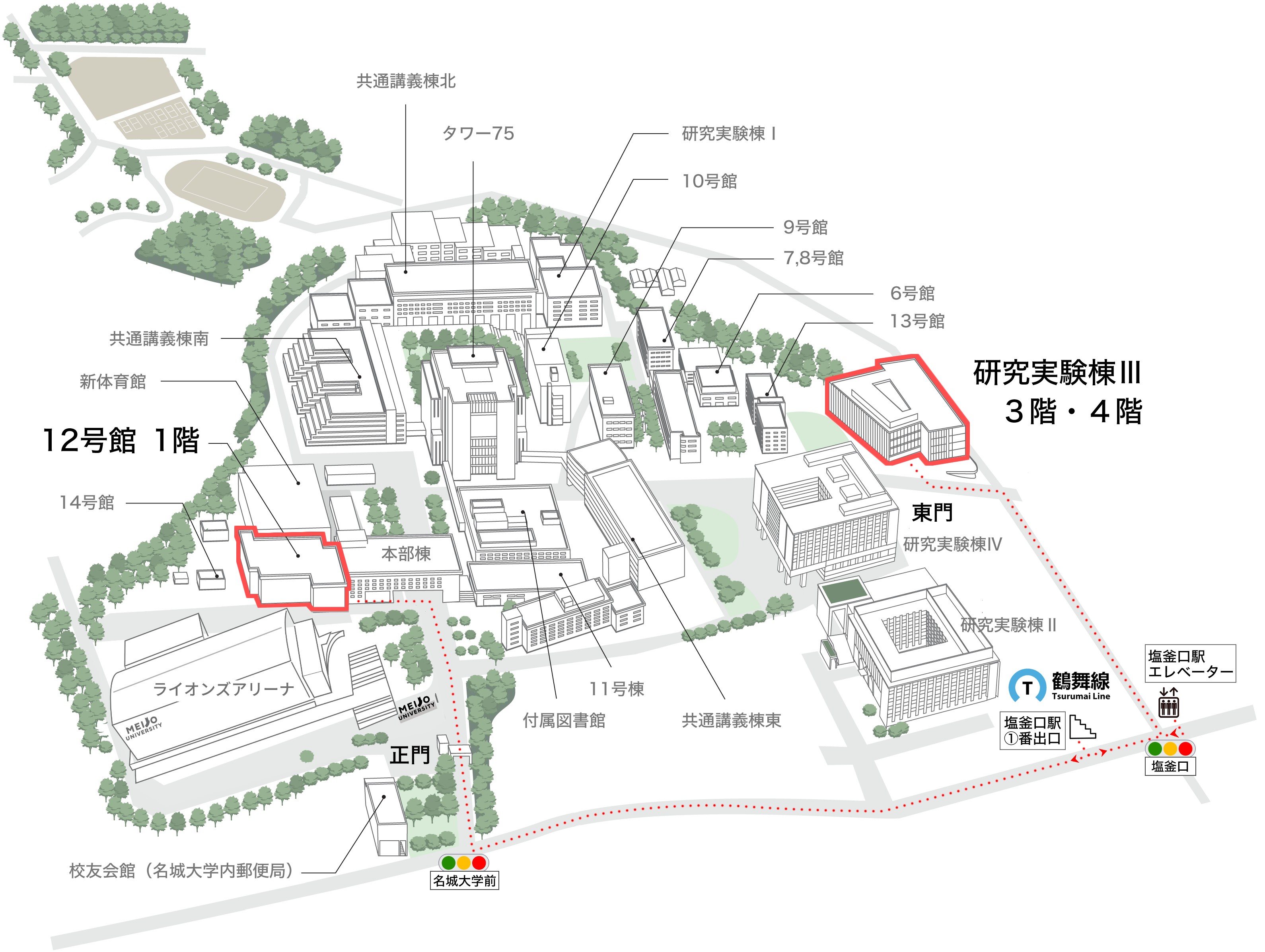 ●または、塩釜口駅エレベータ出口(1か所)を出て右へ。「塩釜口」信号は直進し、道なりに「名城大学前」信号まで直進し右折。徒歩約7分。天白キャンパス「正門」を越えた正面左側奥の建物が12号館です。