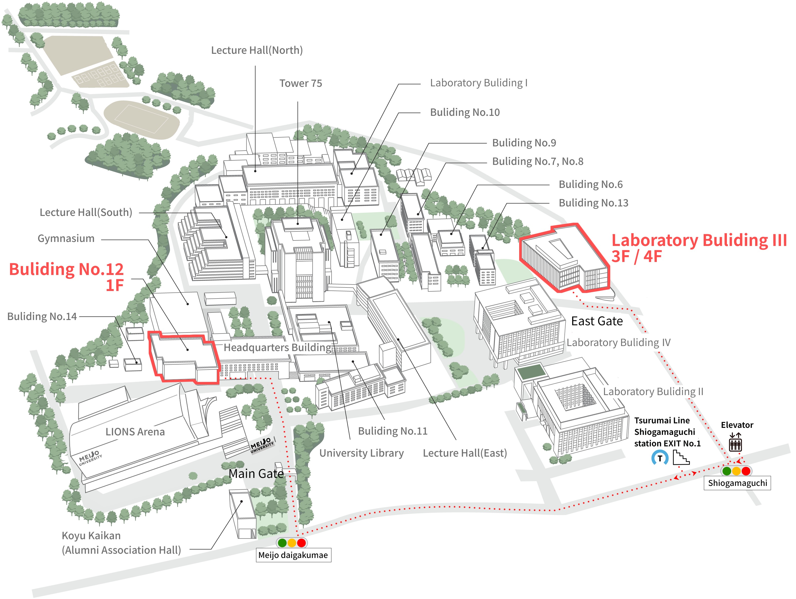 ●Alternatively, exit from the elevator at Shiogamaguchi Station (only one exit) and turn right. Continue straight through the “Shiogamaguchi” intersection, then follow the road to the “Meijo University Mae” intersection and turn right. Walk for about 7 minutes. Building No.12 is located on the left side, behind the main gate of the Tempaku Campus.