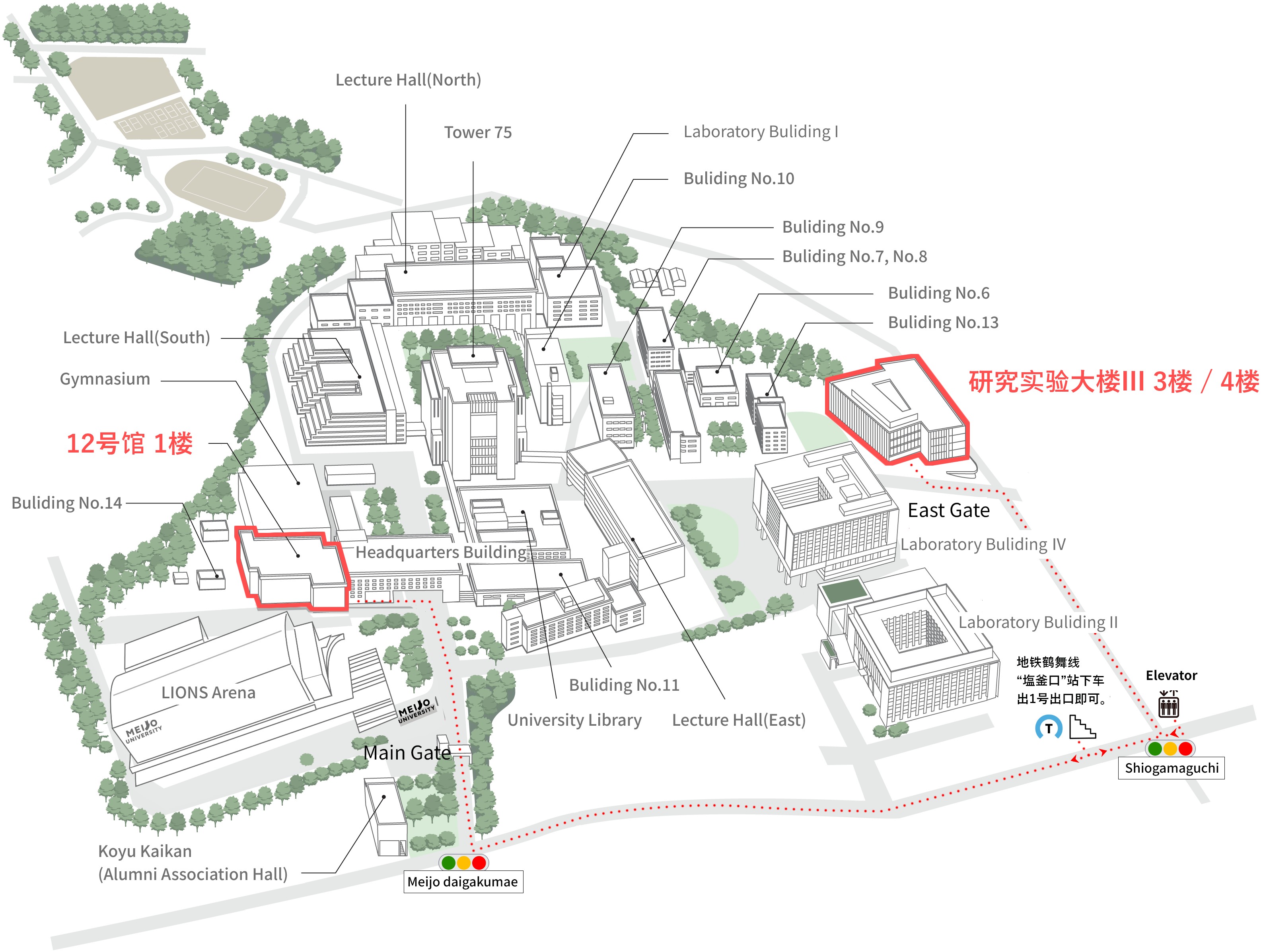 ●或者,从“塩釜口”站电梯出口出来后向右走,直行越过“塩釜口”信号灯,继续沿路直行到“名城大学前”信号灯后右转,步行约7分钟即可到达12号馆,位于天白校区“正门”左侧深处。